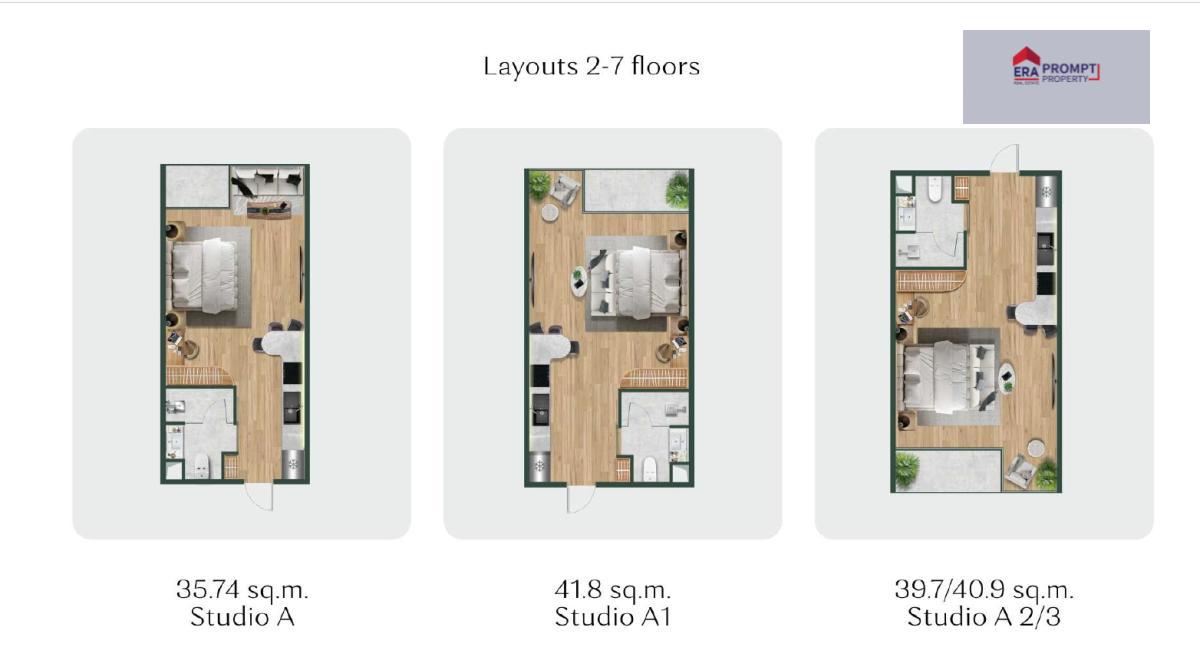 Studio (35.7–41.8 sq.m.): 86 units total (Type A, A-1, A-2, A-3)