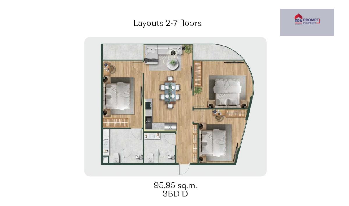 3 Bedroom (95.95 sq.m.): 12 units total (Type D)