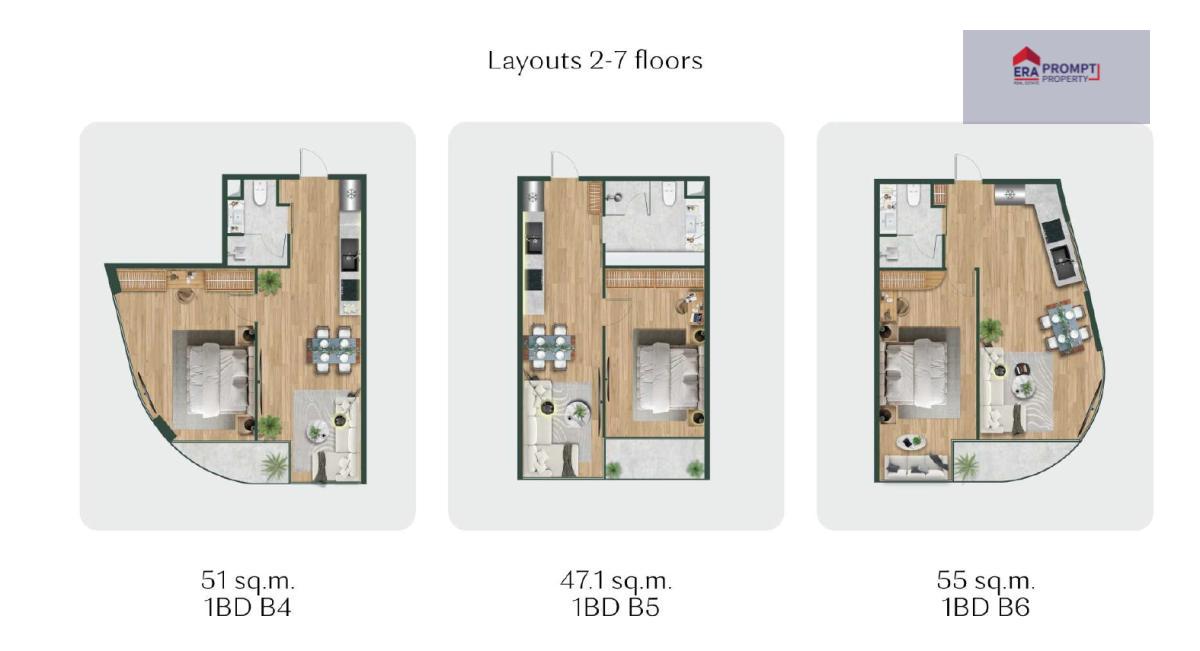 1 Bedroom (47.2–55 sq.m.): 75 units total (Type B, B-1 to B-6)