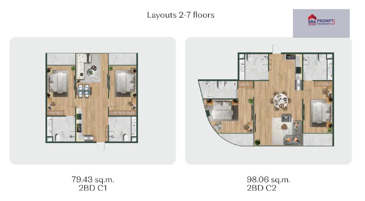 2 Bedroom (79.4β98.1 sq.m.): 14 units total (Type C-1, C-2)